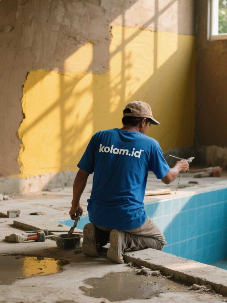 Pengerjaan dimulai dengan memperbaiki kerusakan utama, seperti retakan beton, kebocoran, atau kerusakan pada pipa dan sistem sirkulasi. Proses ini sangat penting agar kolam kembali berfungsi maksimal.